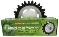 Hedgehog Golf Trolley Fairway Protectors (10”/12”/14”) The Hedgehog is a patented device with parabolic studs which fit onto a standard handpull trolley and allows it to be used without harming the golf course. Many greenkeepers now insist upon hedgehog fairway protectors during the inclement winter months. Help protect your golf course and prchase hedgehog fairway protectors for your trolley today from www.clickgol.co.uk. Fully secure, and fast online service. Many golf clubs ban hand-pull trolleys in winter because the flat wheels compact and smear the turf in wet conditions and burn the grass in frosty conditions. The unprotected turf then takes longer to recover and so the bans are imposed. The parabolic studs of the Hedgehog reduce contact with the soil surface by over 75% and glide over the surface leaving little or no impression and therefore inflict little or no damage. Rather than imposing a full trolley ban during the winter, many clubs are now using a ‘restricted’ trolley ban, where pull trolleys fitted with Hedgehog Fairway rotectors are allowed to be used. The reduced resistance makes your trolley easier to pull in all conditions. Can be left on your golf trolley wheels throughout the whole year. Hedgehog fairway protectors are supplied with two in each pack and are designed to slip over standard trolley wheels measuring 254mm x 76mm. To fit the Hedgehog Fairway Protectors simply ensure your trolley wheels are clean and preferably wet. Attach the three fitting clips around the inside of each Hedgehog and push the Hedgehog over the trolley wheel. Once the Hedgehog is centered on the wheel, check that all the clips have located correctly and securely. Please note that the Hedgehog Fairway Protectors are only designed for use on hand pull trolleys.